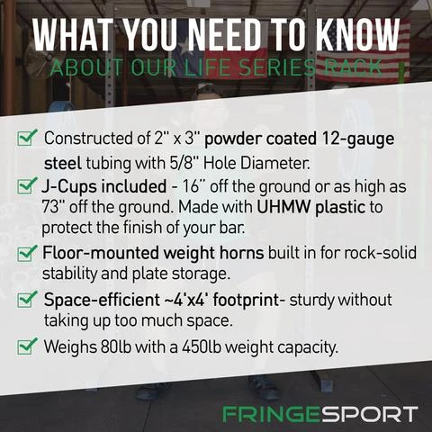 The Fringe Sport Squat Rack with Pullup Bar- Life Series is the best value squat rack + pullup bar setup on the market today. If you’re looking for a great rack at a great price, stop looking- you’ve found it.